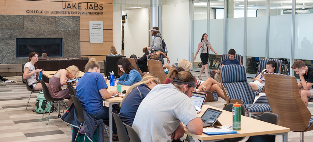 Students study in the main lobby of Jabs Hall