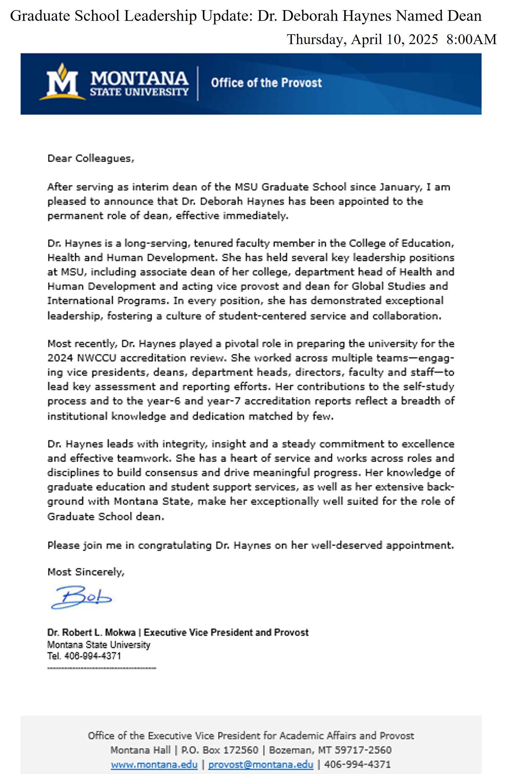 Despite this clear expectation in Section 5b ("The President of Montana State University shall confer..."), not one word was exchanged between the president and provost and the Faculty Senate leadership when Deborah Haynes was announced unilaterally by the administration as the interim Graduate Dean.
